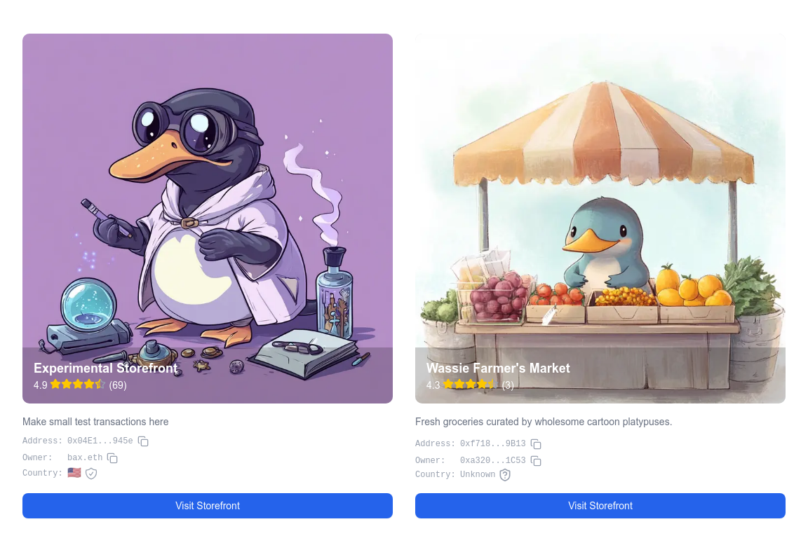 Currently, the storefront owner's address is verified using Coinbase's Onchain verification service. In the future, we may add more verification services.